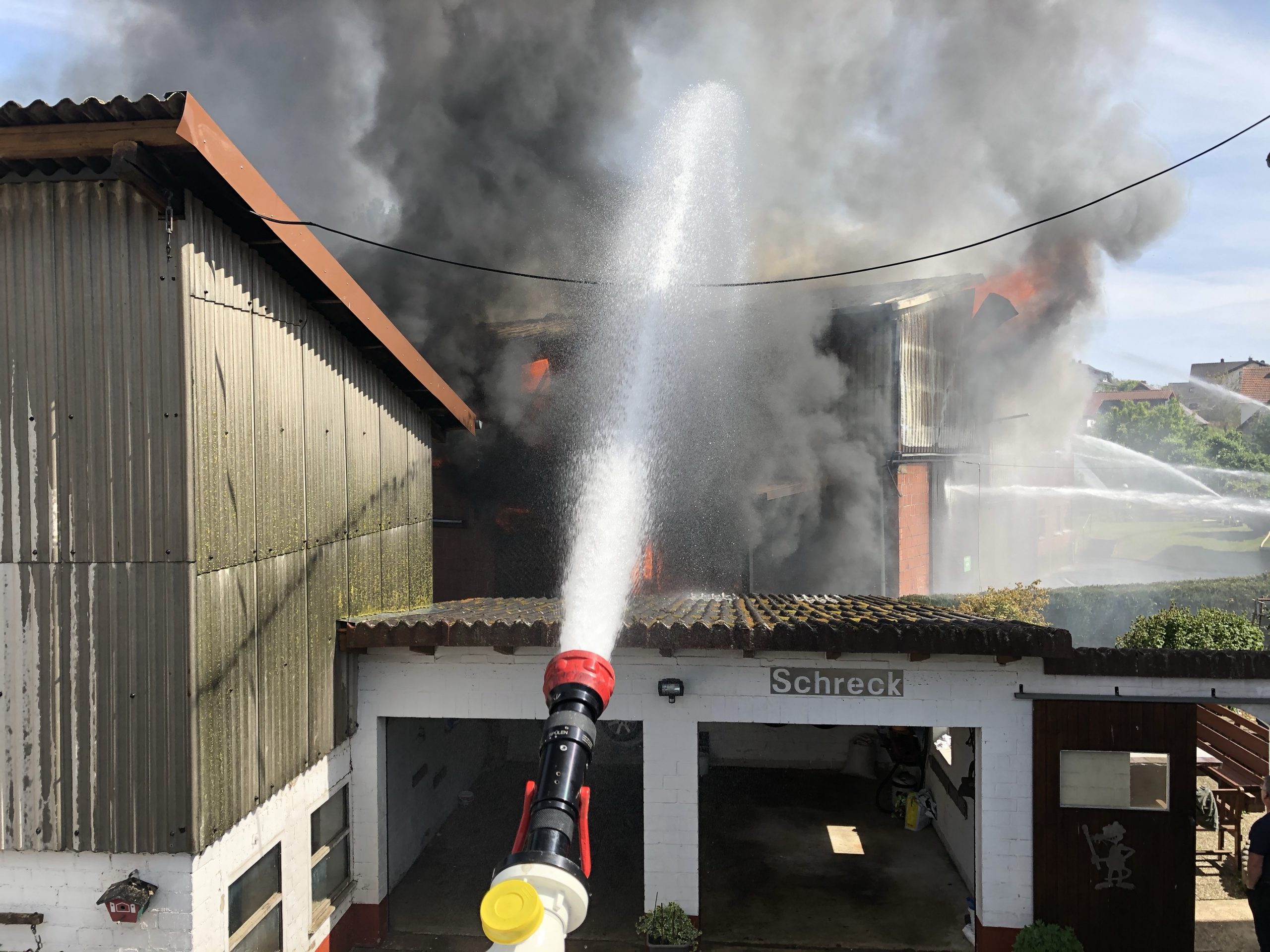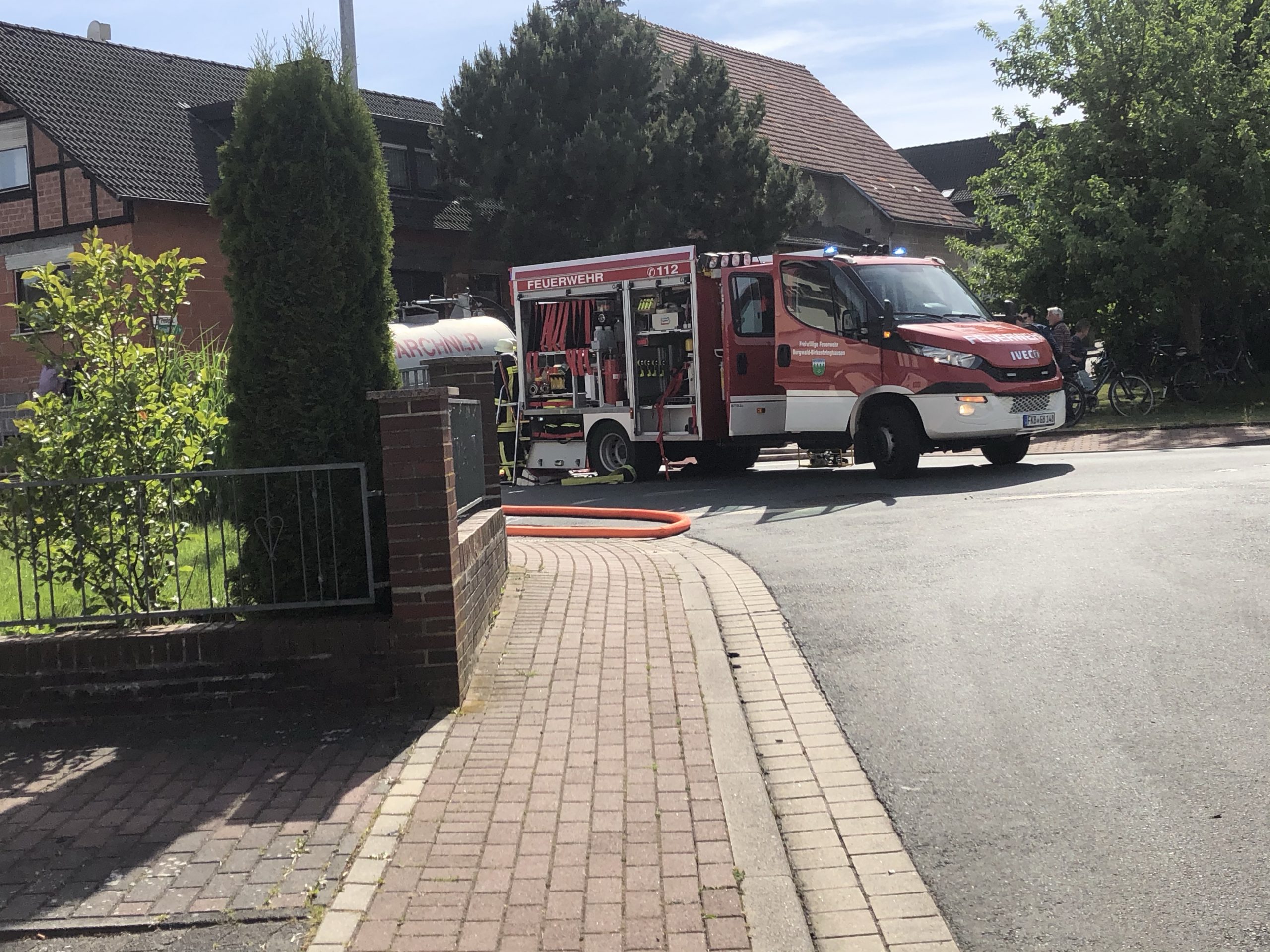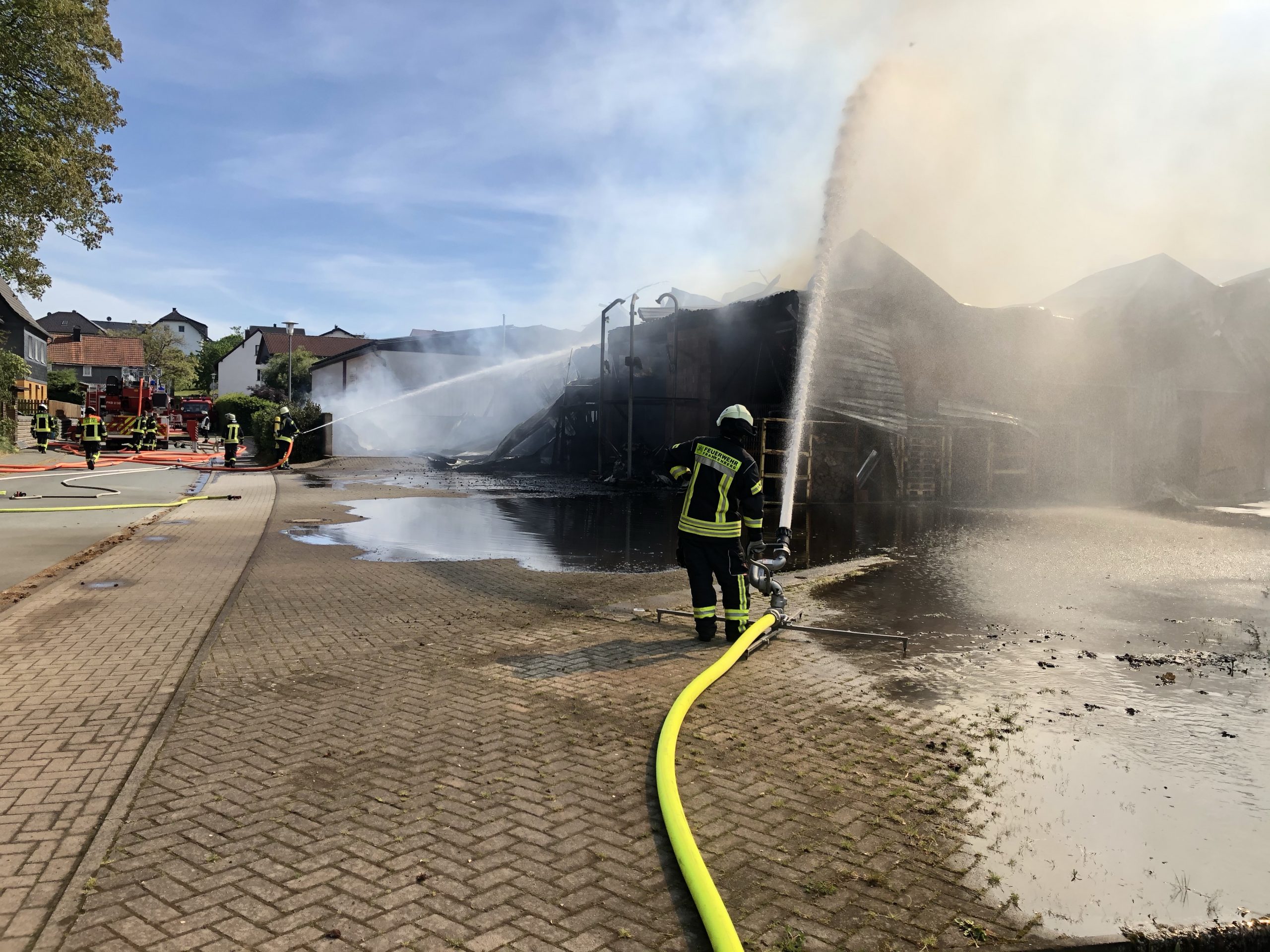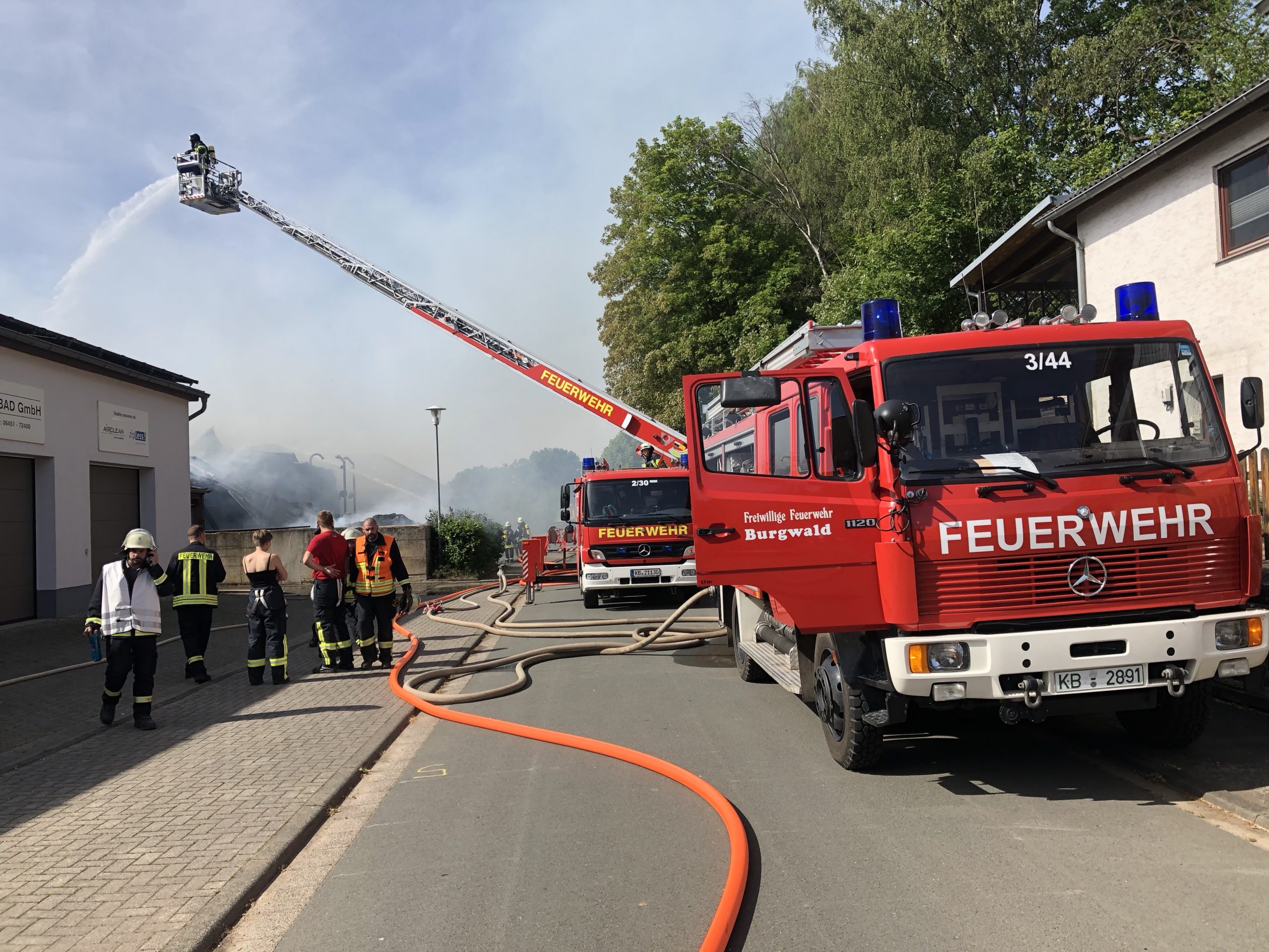 In Burgwald-Birkenbringhausen kam es am Dienstagnachmittag zu einem Großbrand im Ortskern. Durch die Leitstelle Waldeck-Frankenberg wurde Großalarm für die Burgwalder Feuerwehren, die Drehleiter der Feuerwehr Frankenberg und die IuK-Gruppe des Landkreises ausgelöst. Zur Unterstützung der eingeleiteten Löschmaßnahmen, wurden ein Wenderohr über die Drehleiter und zwei Wasserwerfer in Stellung gebracht. Der Gerätewagen-Logistik mit der Atemschutzkomponente des Landkreises rückte ebenfalls nach Birkenbringhausen aus. Die stellvertretenden Gemeindebrandinspektoren Dirk und Volker Engel leiteten den Einsatz.